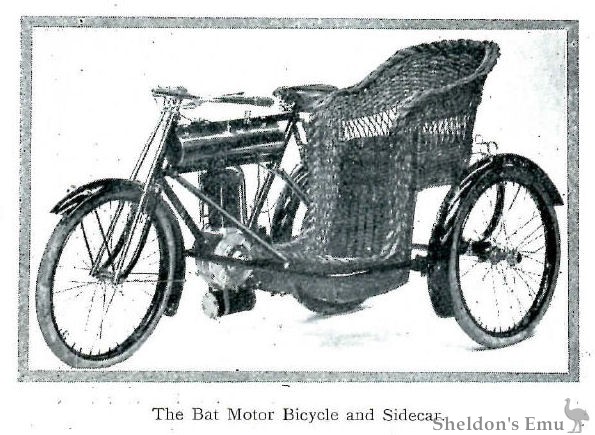 A wipe contact, the contact-breaker cover being held by one screw. A new side-carriage specially made for the Bat; the trailing wheel can be set nearer the bicycle, so as to allow the machine to go through narrow doorways. We show the frame under test. The new Bat forecarriage is very rigid; it has patent steering, and special brakes on the front wheels, which are very-powerful. Both front and rear brakes are operated by levers placed near the footrests. Transparent mica wind deflectors are fitted to cool the engine.The car bodies are to be of wood or wicker, with space for tools under the seat. The engines will be the 2¾ h.p. M.M.C. and an M.M.C. specially made for the Bat, with mechanically-operated valves; also one with new 3½ h.p. M.O.V. Minerva. A novelty will be a patent stand fixed on the crank case, which allows the back or front wheel to be raised off the ground at will. A new large toolbag is fitted as an extra, clamped on rear mudguard. It consists of two large drawers, with a space underneath.