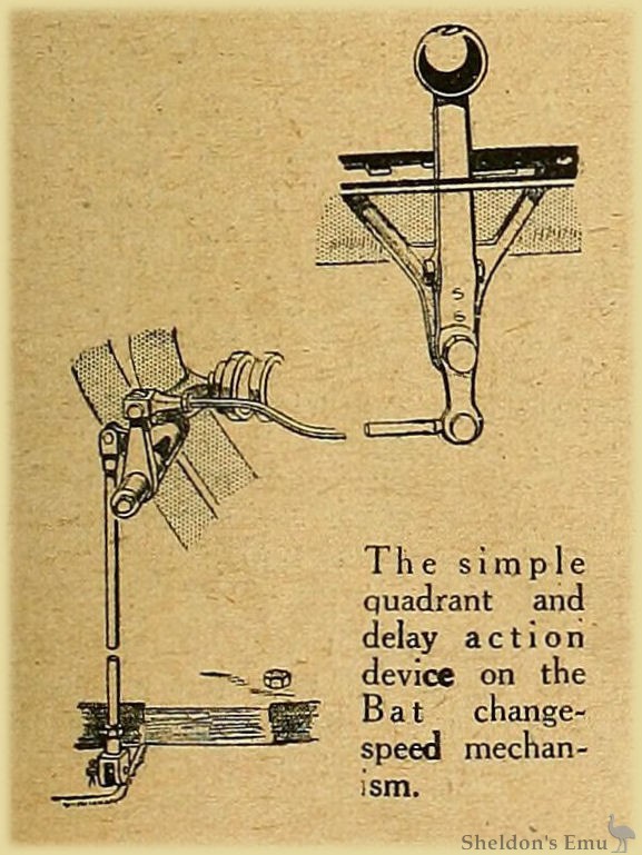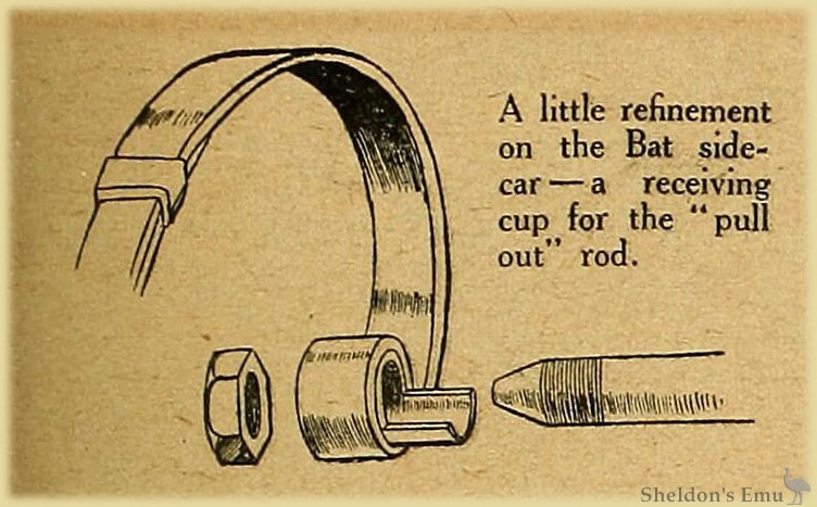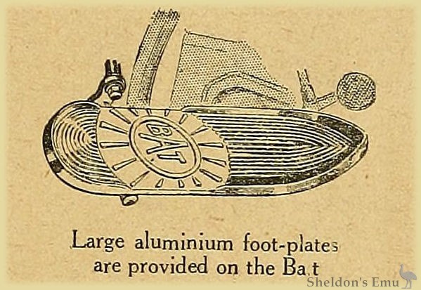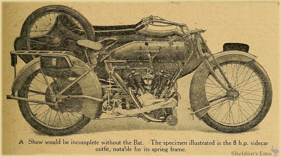 A Show would be complete without the Bat. The specimen illustrated is the 8 h.p. sidecar outfit, notable for its spring frame.