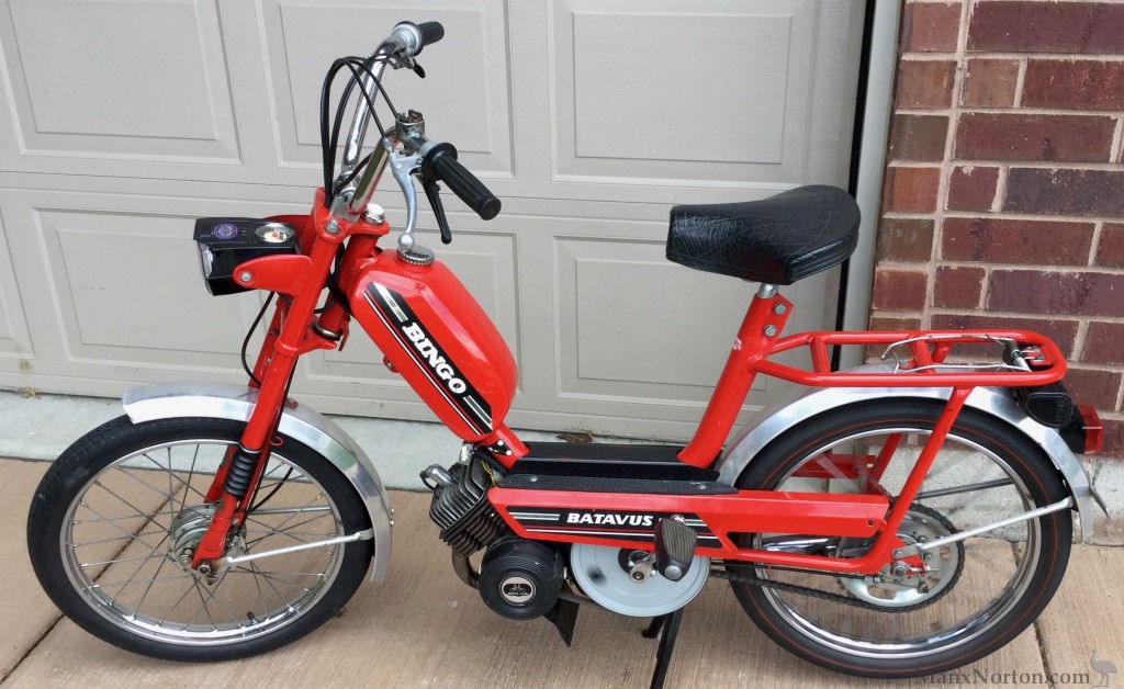 The Batavus Bingo was made from the mid to late 70's. This moped had a Laura M48-02 single speed engine and was available in 20, 25, and 30 mph versions. The Bingo is very similar to the Batavus VA with the most noticable difference is the placement of the rear shocks.