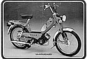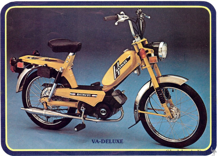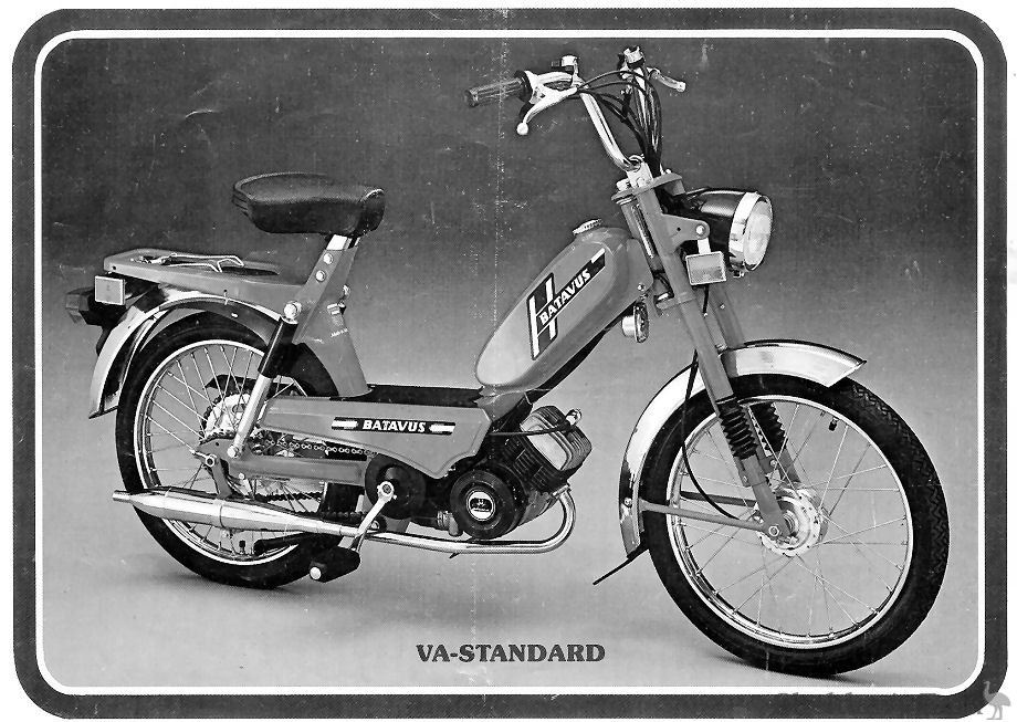 The VA uses the single speed two-stroke Laura M-48 engine. The Batavus VA was available in 20, 25, and 30 mph versions in the Deluxe model and Standard model. The features listed for the VA included stainless steel front and rear fenders, lockable steering, electric horn, illuminated speedomter/odometer, and 16-inch Michelin moped tires.
