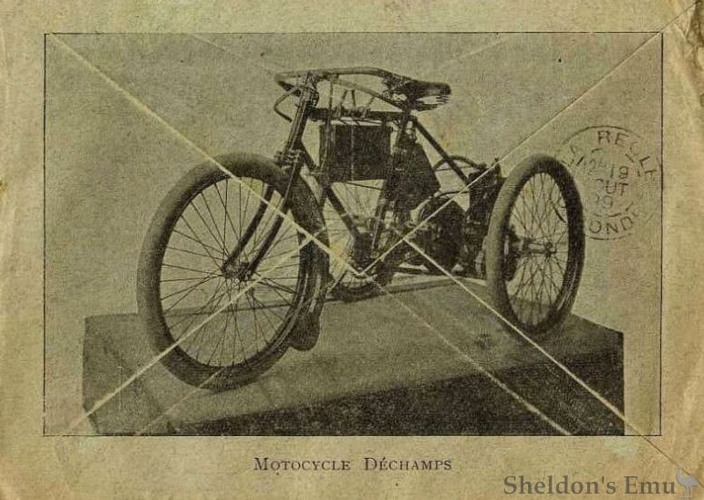 SA des Ateliers HP DECHAMPS was established in 1898 and in March 1899 they presented a tricycle powered by a 1¾ h.p. De Dion-Bouton engine along with a two-seater voiturette with a front-mounted, air-cooled Dechamps 3 hp twin. In December 1899 company name changed to SA des Moteurs et Automobiles DECHAMPS and moved to larger premises at Boudewijnlaan 38 and Zangerstraat 49, Brussels. CEO was M. Van de Vinne.