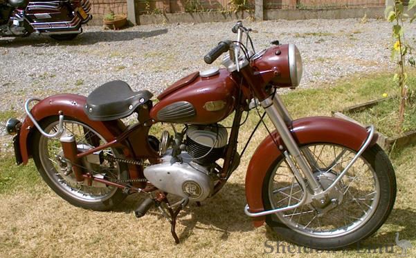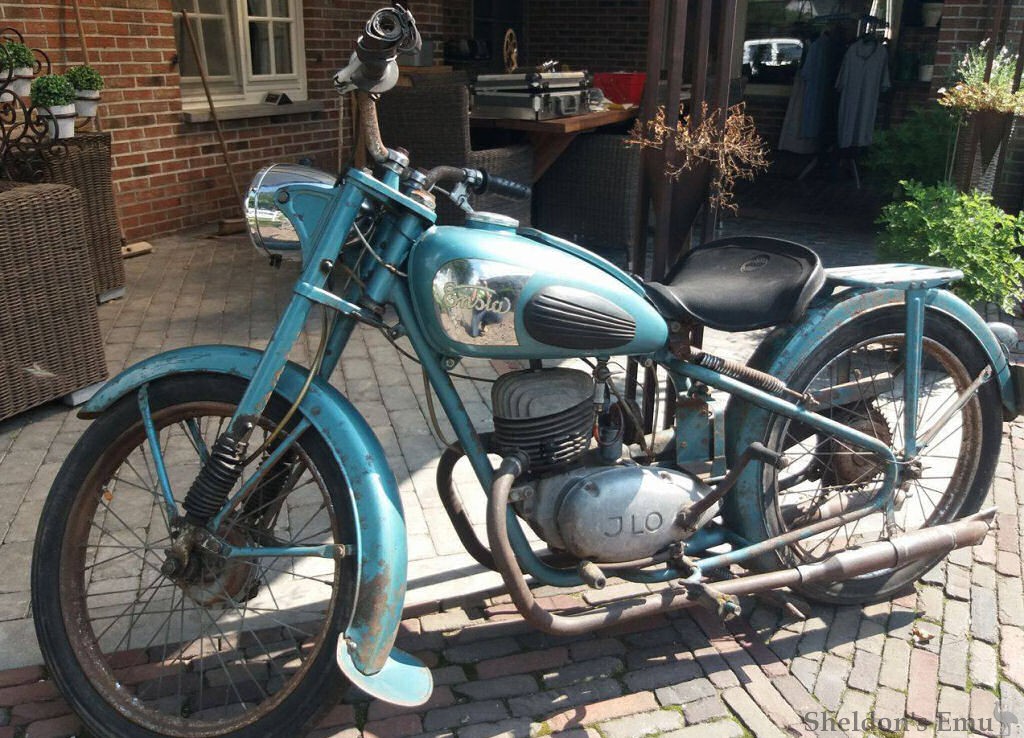 An example illustrated in the gallery is a 250cc JLO built in 1954, plunger suspension, burgundy wtih 6,000 km.