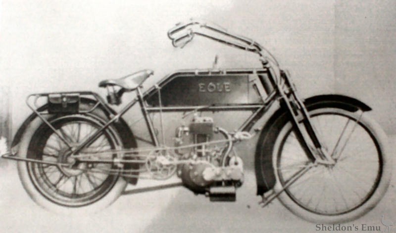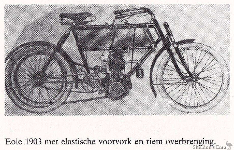 Notes 1. The well-researched book on Belgian motorcycles cited below gives manufacture dates of 1899 to 1908. Tragatsch says simply "c1900", and Henshaw "c1900-1907". Originally this page read "...1903 until 1914 when manufacture ended at the onset of the First World War", information based on correspondence accompanied by a photograph of an Eole dated 1913.