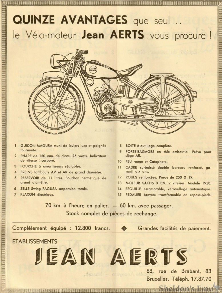 He established a retail establishment in Bruxelles-Nord, Jean Aerts Ets, which offered a motorcycle for sale in 1950. Priced at 12,800 francs it was fitted with a 3hp Sachs engine mated to a 2-speed gearbox and, according to the advertisement at the time, could achieve 70km/h solo and 60km/h with a passenger. The pedal crank could be converted to footrests, and it was also available with a JLO engine and kick-starter.