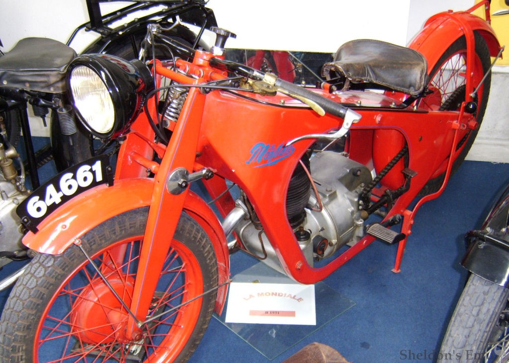 Hallo for your information: we have a la mondiale 350cc 2stroke their own engine in our museum. La mondiale was from Vilvoorde (close to Brussels) and We had a visit from the grandchildren, and got some beautifull pictures of the family and the factory, I have also a book about this company that made form long time machines (leith)