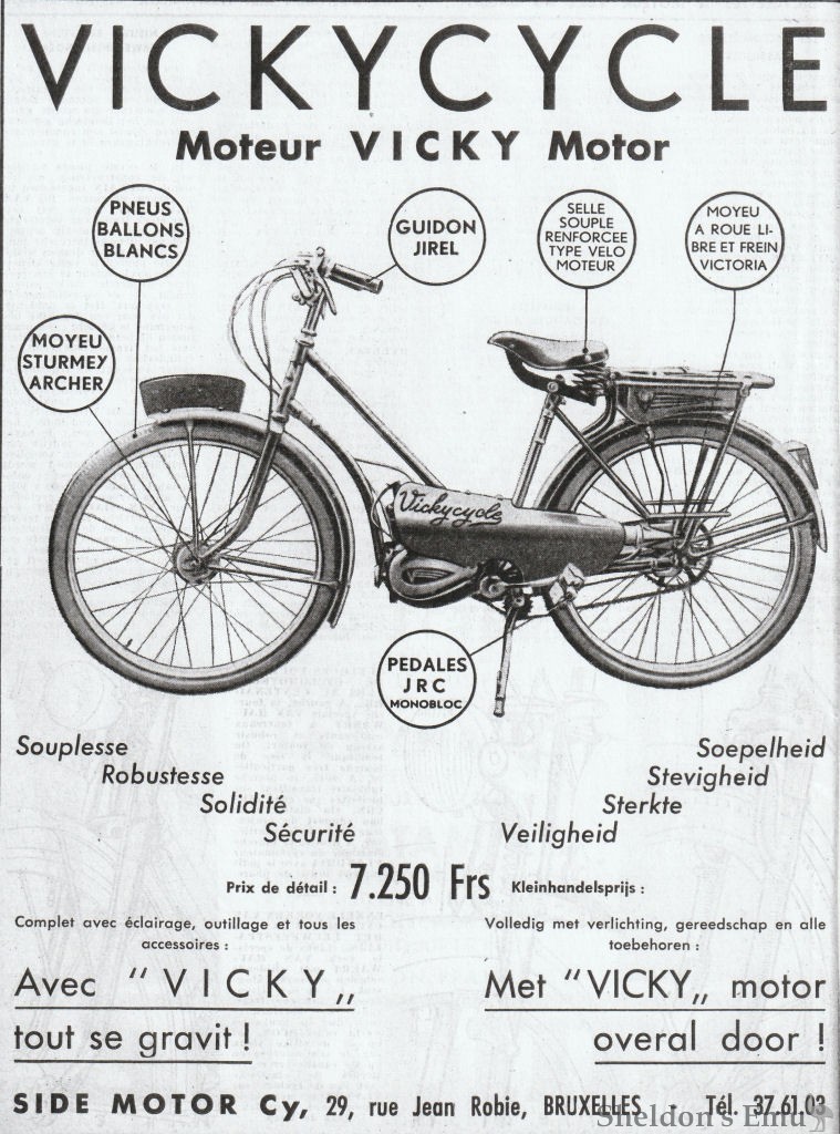When introduced the machines were powered bicycles with Victoria FM38L clip-on engines mounted to the rear wheel of a bicycle. Later models were mopeds and it is thought that they originated with the German company which produced the enormously popular Vicky mopeds.