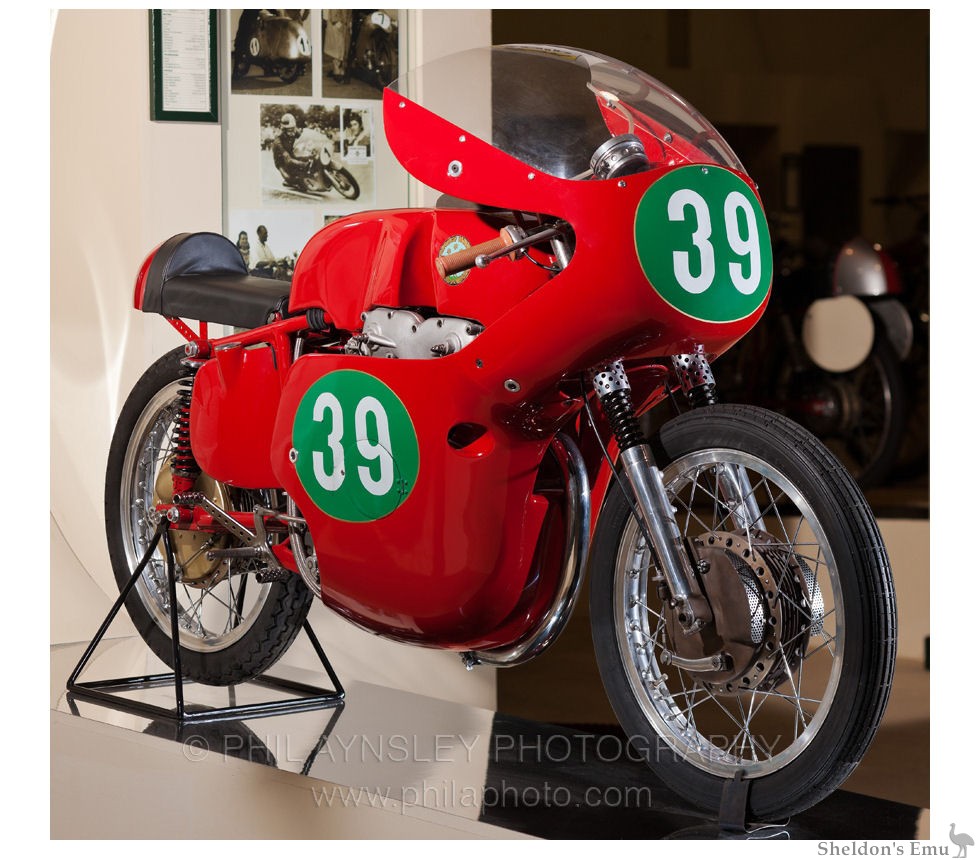 This bike was recovered by Giancarlo Morbidelli in England with help of John Surtees. After the acquisition by Morbidelli, the bike remained in his workshop for several years with several parts missing, including the tank, the front brake and the fairing. The tank was found by Mr Imperiali of Rome, an old Motobi dealer and race preparer; the front brake was donated by Mr Fernando Bruscoli, a rider from Pesaro, who had received it from Mr Marco Benelli, one of the Benelli factory owners; the fairing was rebuilt by Attilio Donzelli, an experienced coachbuilder, also from Pesaro.