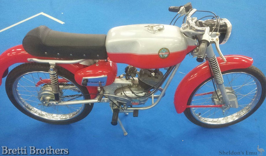 La Benelli, per fare un po’di storia, entra nel mondo dei ciclomotori nel 1956 con un motorino a telaio in lamiera stampata e forcella anteriore a biscottini, che presenteremotra qualche settimana. Un’entrata in ritardo, quando già la maggior parte delle grandi Case aveva in listino il proprio 48 o micromotore da anni.Il motore che lo equipaggia saprà però mantenersi longevo: salvo qualche cambiamento estetico rimarrà sulla breccia, con alterne fortune, sino agli anni 80 inoltrati. Appena presentato questo 48, denominato Ciclomotore, solo due anni dopo nasceva la necessaria versione sportiva, con carburatore da 15 mm e condotti di ammissione e scarico maggiorati, che portavano il simpatico motorino pesarese ad oltre 80 km orari. Pregio di questi 48 l’ottima cura costruttiva che garantiva affidabilità e prestazioni al Top della gamma unitamente a colori sgargianti e sempre alla moda. Arrivano gli anni 60, occorre adattarsi e fare un po’ di restyling : il vecchio 48 sport ( presentato anche in versione 51 cc per avvalersi della targatura e poter portare un passeggero), muta anch’esso la pelle. Nasce il 48 sprint , “ il ciclomotore per il giovane sportivo” come definisce la rèclame del 1962. Esso ha ora colori metallizzati rosso e oro, e un nuovo telaio a doppia canna e doppia culla per la massima rigidità e tenuta.
