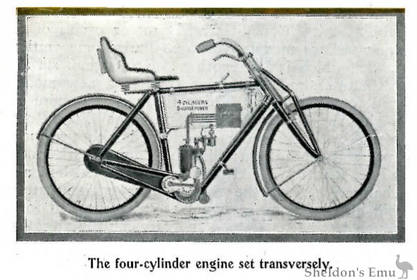 Nottingham, is showing two models of his four-cylinder machines, which can hardly be called bicycles, a better term being single-track cars. In one case the four cylinders are set transversely, and the others longitudinally, the drive in both cases being by chain from a countershaft. Both the crankshaft (which is one solid forging) and the camshaft are mounted on ball bearings. All the valves are mechanically operated, and in one case are arranged in front of the engine. Four coils are fitted, and one set of batteries, the latter being carried in a basket arranged at the rear of a very comfortable wickerwork seat. A friction clutch is fitted, operated by a lever on the handle-bar.