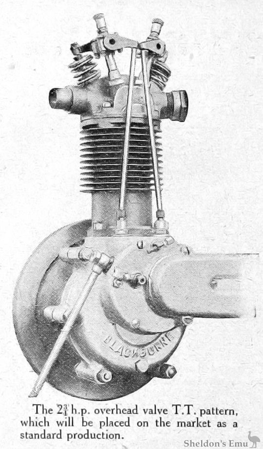 BLACKBURNE engines for 1922 will include at least two completely new models. These are the 4 ¼ h.p. and the 2 ¾ h.p. T.T. engines. The larger of these has a bore and stroke of 85 X 97 mm. (548 c.c), and like all the latest pattern Blackburne engines the finish has been much improved, the crank case being sand-blasted, and the magneto and timing gear cases polished.