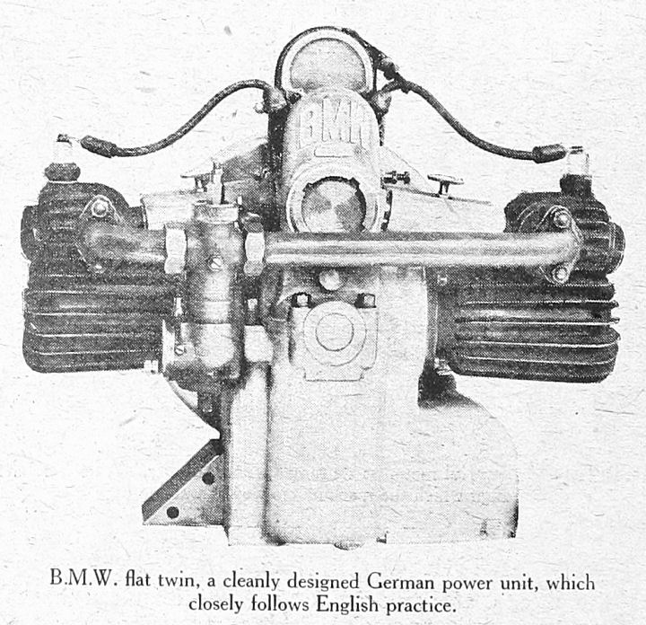 B.M.W. flat twin, a cleanly designed German power unit, closely follows English practice.