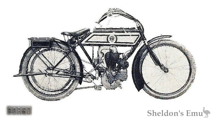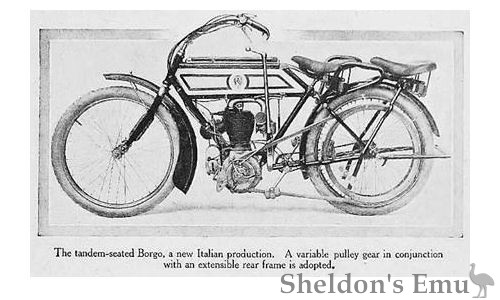 We understand that the Borgo (but with a single gear) is being supplied in large quantities to the Italian Government. The Italian manufacturers are making but few changes for 1916, as the more important houses are fully occupied with Government work, while business in general is more or less at a standstill. Messrs. Bianchi, whose motor cycle we illustrated and described some time ago, are adopting belts instead of chain drive, for the sake, we presume, of economy and simplicity.