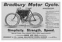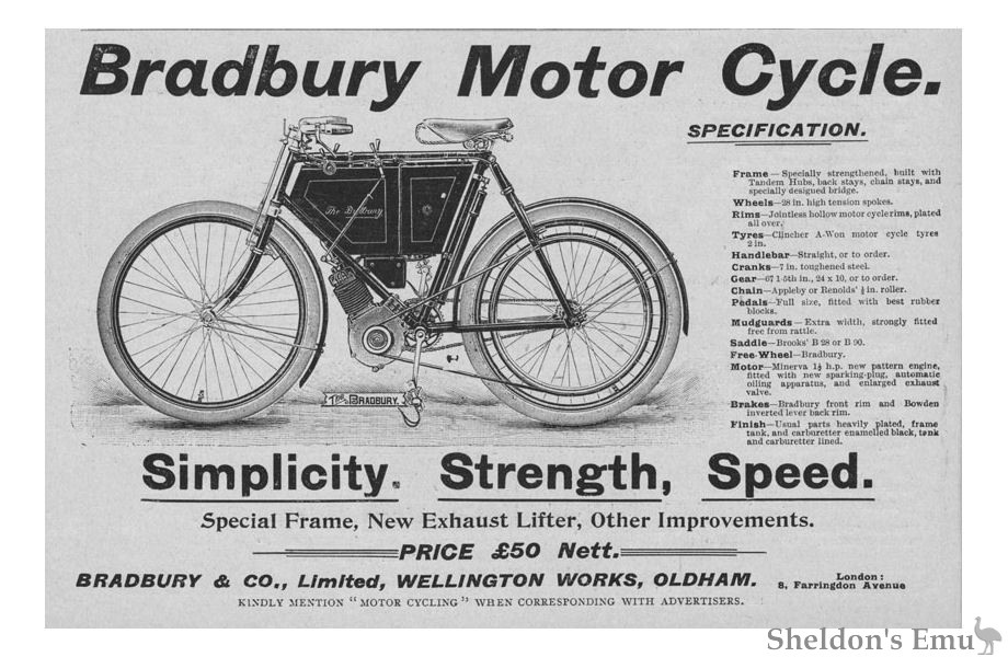 The connections for the wiring are exceedingly simple and effective, as they are effected by spring snaps. The first movement of the exhaust valve lifting lever cuts the current. Lubrication is provided by a pump placed conveniently at the fore part of the tank, where the oil reservoir is situated. The drive is through a Lincona belt, the gearing being about seven to one. The girder front forks are particularly good. On a 2.5 h.p. machine shown there is provided an extra rear seat readily attached and detached, and carrying an extra tank, with compartments for both oil and petrol. The rear passenger places his feet on a pair of pedals provided for the purpose. A well-designed trailer is exhibited, and a motor-bicycle driven by a Clement engine with a chain drive is also shown.