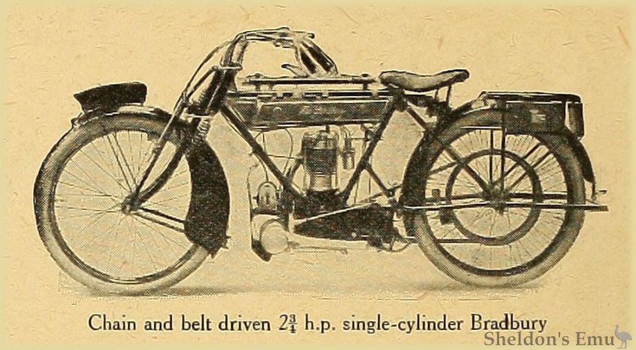2¾ h.p.; 74.5x80 mm. (349 c.c); single-cylinder four-stroke; side-by-side valves; hand pump lubrication; B. and B. carburetter; chain-driven magneto; three-speed Bradbury gear; chain and belt drive; 26x2½ in. tyres.