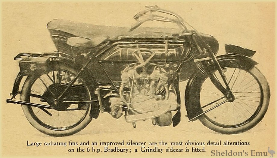 Large radiating fins and an improved silencer are the most obvious detail alterations on the 6 h.p. Bradbury; a Grindlay sidecar is fitted.