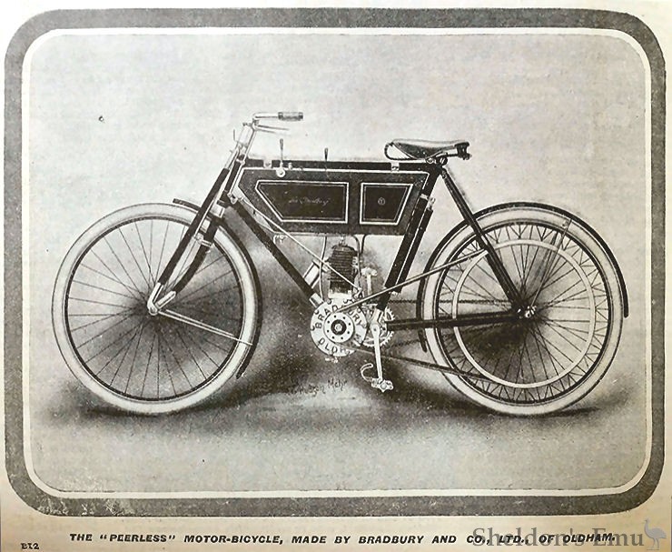 Peerless motorcycles made between 1902 & 1908 were built by Bradbury in Oldham, Lancashire and were very similar to the standard Bradbury machines with the exception of the engine. They were fitted with 2hp &