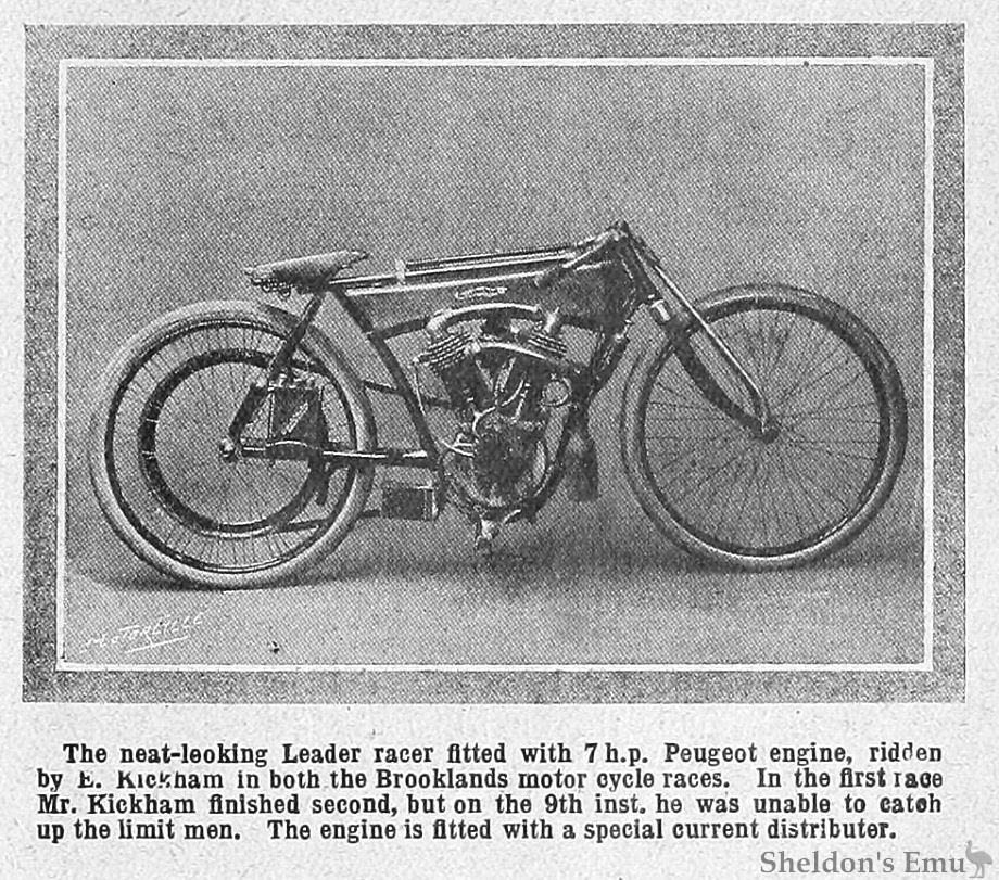 "The neat-looking Leader racer fitted with 7 h.p. Peugeot engine, ridden by E. Kickmam in both the Brooklands motor cycle races. In the first race Mr. Kickham finished second, but on the 9th inst. he was unable to catch up the limit men. The engine is fitted with a special current distributer."