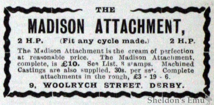 Madison motorcycle attachment engines were manufactured in Derby in 1903. Rated at 2 b.h.p., they were designed to fit any standard roadster bicycle.