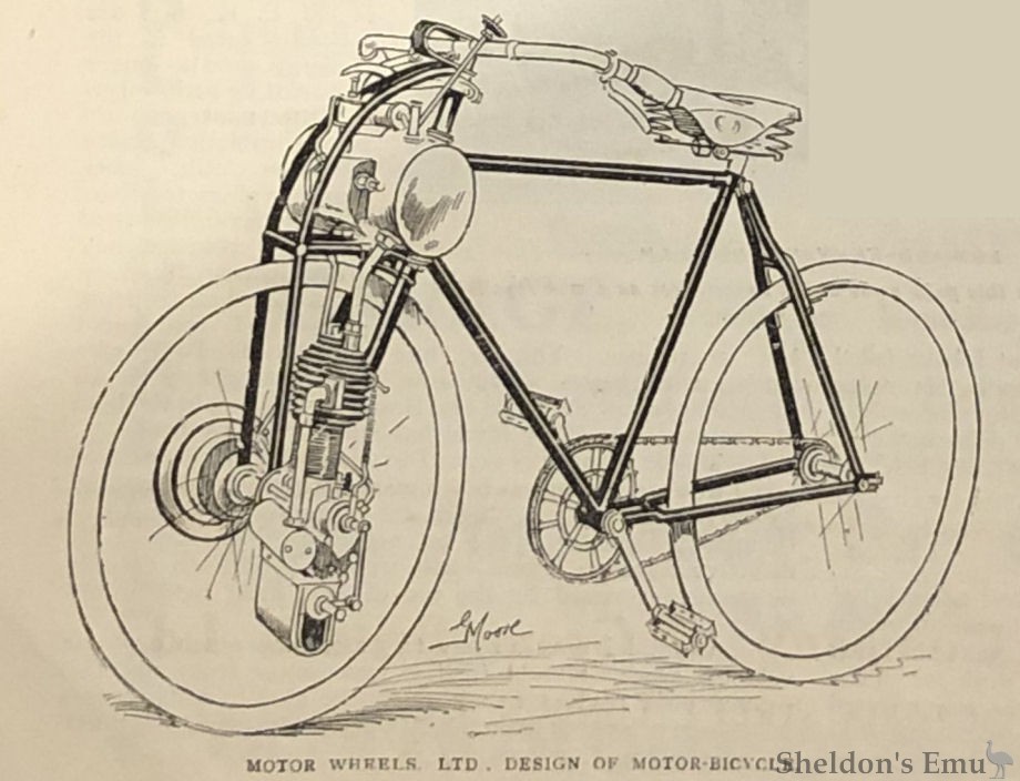 The machine illustrated is the speciality in motor-bicycles brought out by Motor Wheels, Ltd., Euston Road, London. It departs entirely from conventional practice in design, the whole of the motor gear being carried by the front forks. The motor is a Simms, fitted with magneto ignition, and the drive is by a Crypto gear to the front wheel axle. The petrol tank, carburetter, coil and accumulator are supported on a bracket attachment carried by the forks.