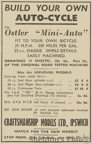 Craftsmanship Models Ltd. of Ipswich sold plans for a 25cc bicycle engine for 10/6d (ten shillings and sixpence). Development of the project began around 1941 or 42, and the plans were advertised in the late 1940s and early 50s.