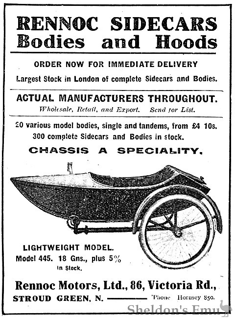 Manufactured by Rennoc Motors Ltd, Stroud Green UK 1920, and in 1922 at the address below..