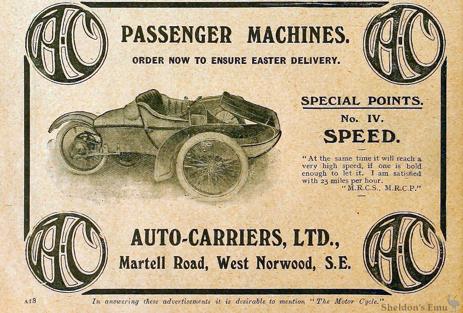 In 1907 a passenger version appeared named the Auto-Carrier Sociable. It had a seat in place of the cargo box.