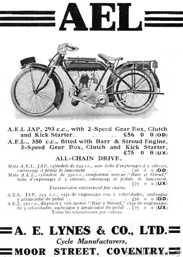 The initials of A. E. Lynes gave the AEL marque its name. Lynes was a retail bicycle, spares and accessories dealer in Moor Street, Coventry, with a shop in the high street.