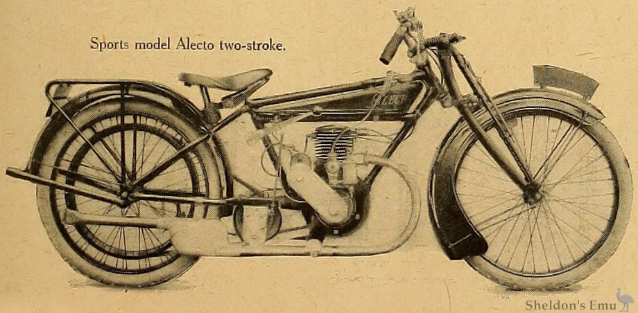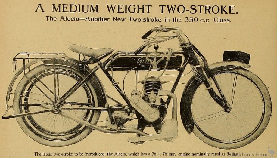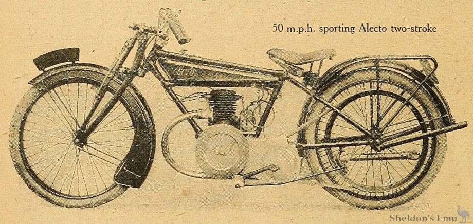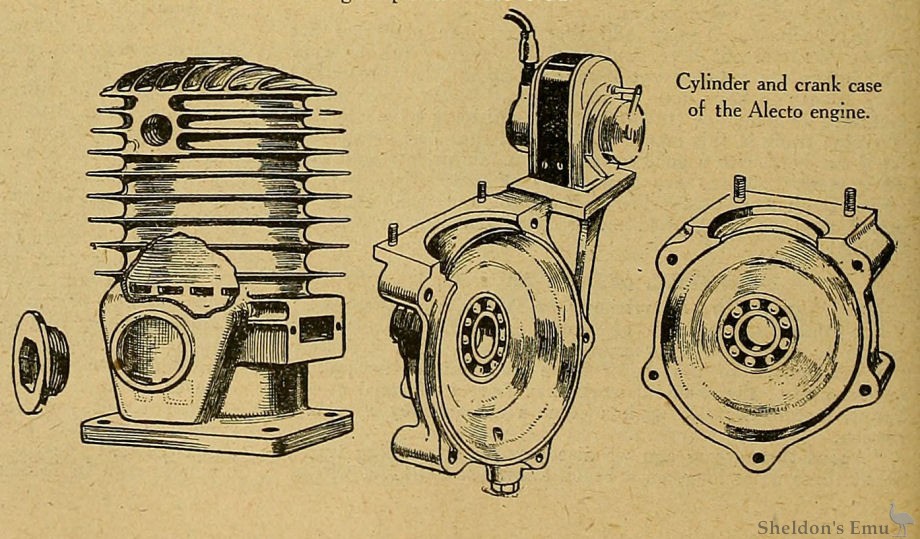 A NEWCOMER in the motor cycle world is the 3 1/2 h.p. Alecto, quite an interesting mount, the engine, of which is manufactured by the makers of the machine, Messrs. Cashmore Brothers, Hildreth Road, Balham, London, S.W. The engine possesses several novel features, and is constructed on the three-port system. There is a spacious transfer port, in which there is a plug l 1/2 in. in diameter, and when this plug is removed it allows easy access to the ports for cleaning. The exhaust port has a twin outlet, each outlet being l 1/4 in. in diameter, and it exhausts into a silencer 5in. in diameter and 9in. long, three times the capacity of the cylinder, the exhaust finally passing into the air through a long tail pipe l 1/2 in. in diameter. The release valve exhausts directly into the twin exhaust pipe union, and when the compression is released there is complete absence of sound. This does away with one of the most objectionable features of many two-stroke engines.