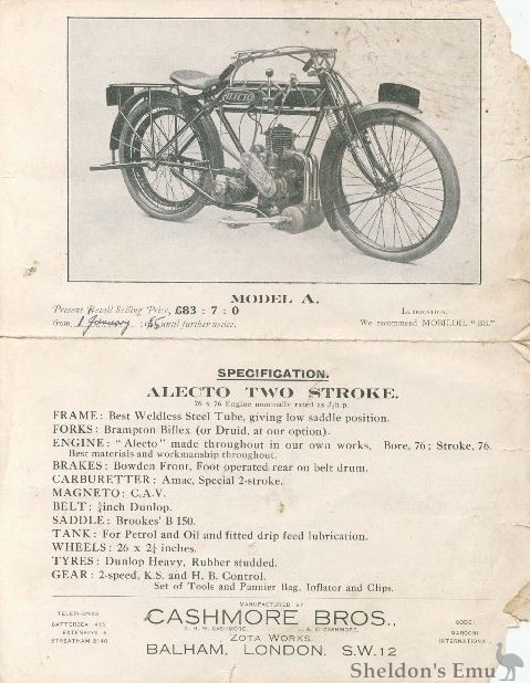 i have a cashmore bros. page promoting the Alecto model a. It has a pic and technical info, also quote from M.C. mag 31-7-1919. cant find anything on line about these.