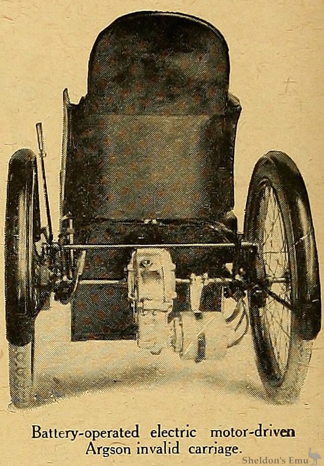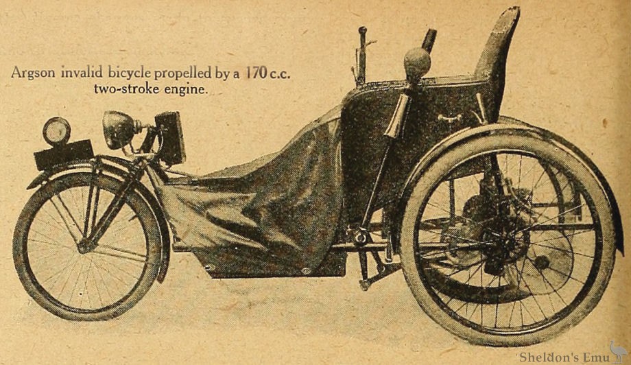 1921 The principal product of this company in its early days was the manufacture of a specially designed and adapted light motor tricyle. This machine was specifically intended for use by invalids who had lost a limb as as result of World War I. There were very many such individuals and so there was a large market for the machines. The tricycle had a single front wheel and the other two fastened to a common rear axle, and driven by the company's own Beaufort 170cc engine. The same engine also appeared in the Beaufort lightweight motorcycle built by Argson. It was also sold to other assemblers of lightweight motorcycles.