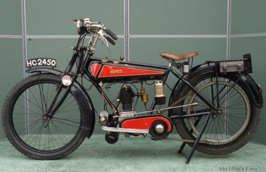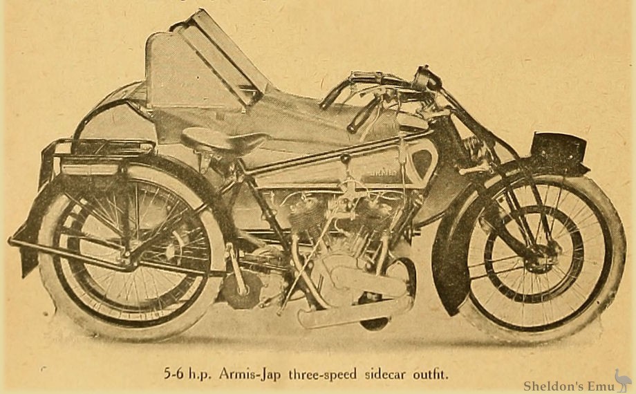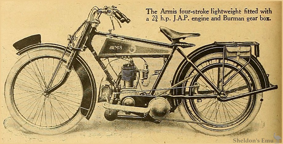 In 1919-1920 they offered two models, both with Precision engines. The larger of the two used the old 8hp 269cc sv V-twin Precision and a three-speed Sturmey-Archer gearbox. There was also a medium-weight that had a new Precision 349cc two-stroke engine delivering power via an Enfield two-chain, two-speed transmission. The V-twin model was short-lived, and the transmission of the two-stroke was via a Burman Gearbox. Armis also listed a complete sidecar combination as well as a solo JAP model.