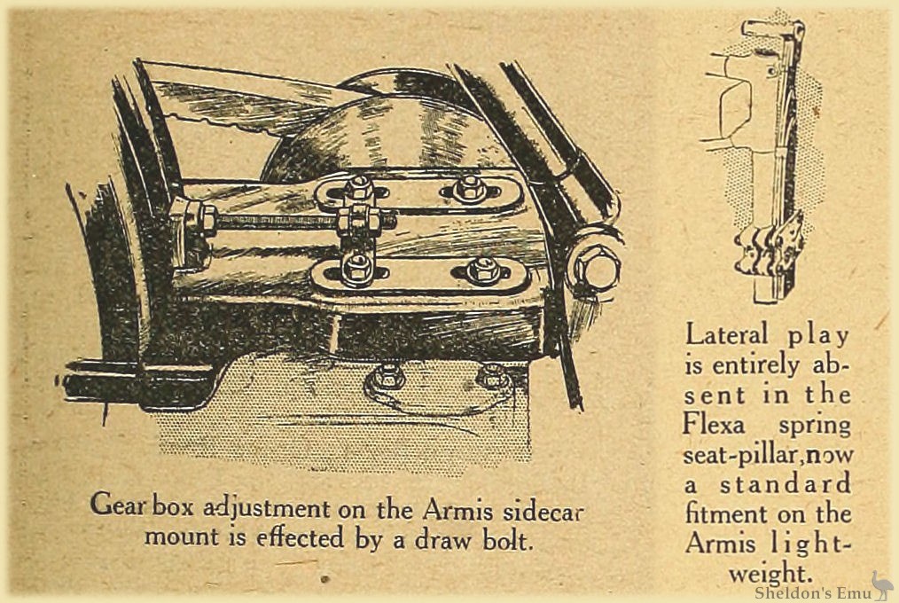 This is also shown as a sidecar outfit; its power unit is a Precision two-stroke, fitted with mechanical lubrication and detachable head, while a Maglita set supplies current for both ignition and lamps. It should be ideal for the man of moderate means, who requires a machine which can be used satisfactorily for both business and pleasure. Both frame and tank follow the lines of the model described above. This outfit is fitted with a Flexa spring seat-pillar, which carries the saddle on a laminated spring. The saddle is the well-known XL'All. Both models are fitted with celluloid-covered handle-bars, so that the owner of an Armis need not worry about too much plated work to clean. The weight is 180 lb. solo.