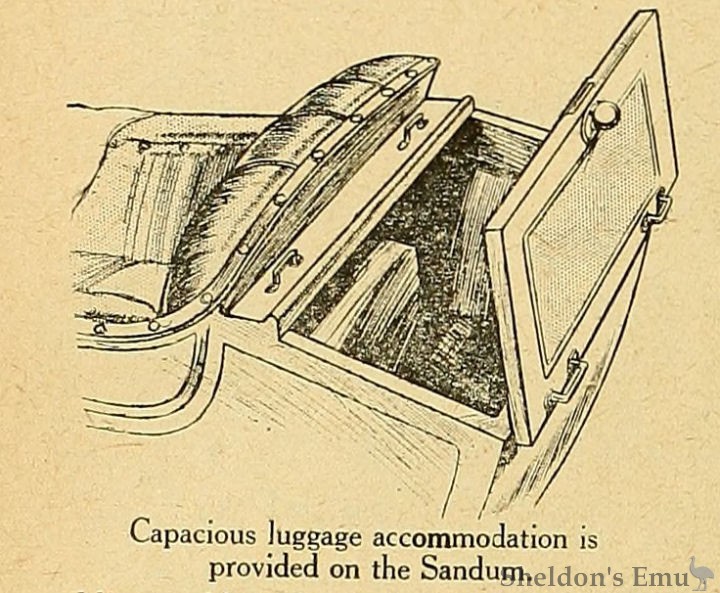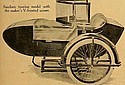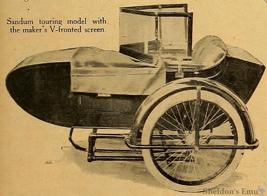 One of the most enterprising of sidecar manufacturing firms, the Sandham Eng. Co., offers for the forthcoming year a range embracing every conceivable type. Interesting details in the way of windscreening are numerous, showing that this important item has been studied from actual use of the sidecar, and not from the drawing office. The Sandum Sociable, for instance, was evolved after numerous experiments in body building which cost the firm £250, but the results pay for the trouble entailed, for this model is unquestionably one of the best ever produced of its kind. There is ample room for an adult and child in the rear seat, whilst another child can be accommodated easily in front, tandem fashion. This has been accomplished without sacrificing the compact design of the body or widening the chassis. The price is £30.