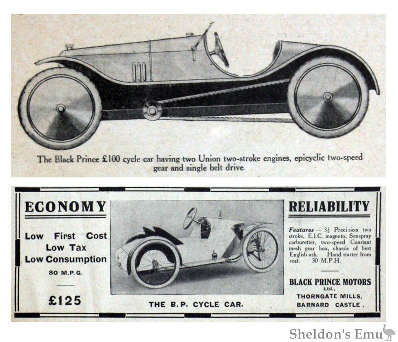 1920 All future prospects were lost when E. W. Cameron committed suicide. With him went the motorcycle and the Black Prince Runabout, a three-wheeler designed by A. G. Cocks which was expected to go into production.