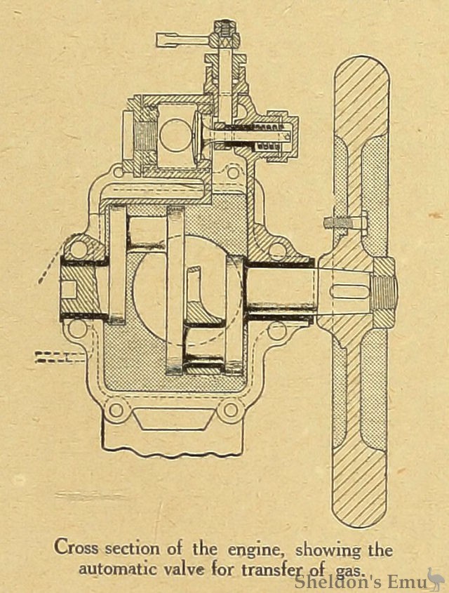 From the crank case the new gases enter the combustion space through an automatic valve directly opposite the plug, therefore four-stroking, even at low speeds, should be almost, if not entirely, eliminated.
