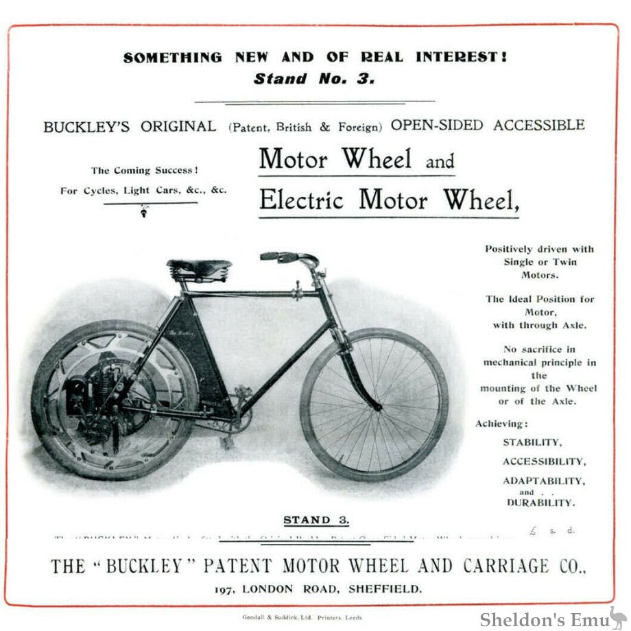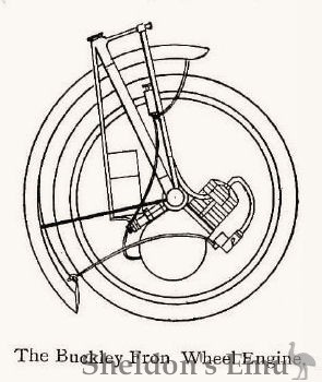 An example of a gear-driven motor bicycle, with the engine contained within the wheel is seen on the stand of the Buckley Patent Motor Wheel and Carriage Co., of Sheffield. In this machine the engine is mounted on a sleeve around the hub proper and drives by a pinion on the crankshaft of the motor on to an internally toothed wheel bolted to aluminium arms on one side of the wheel, the opposite side of the wheel being left open, so as to give a means of ready access to the motor. One of the machines on the stand is fitted with a 2 h.p. engine having magneto ignition. A spray type of carburetter is employed, spirit being supplied to it from a petrol tank, which occupies a position between the seat-tube and the rear wheel. What is described in the catalogue as the Buckley light motor car is also shown. This reminds one somewhat of one of Mr. H. J. Lawson's earlier efforts. It has a front tractor wheel in which a 2½ h.p. Minerva engine is employed driving through gearing of the type before mentioned.