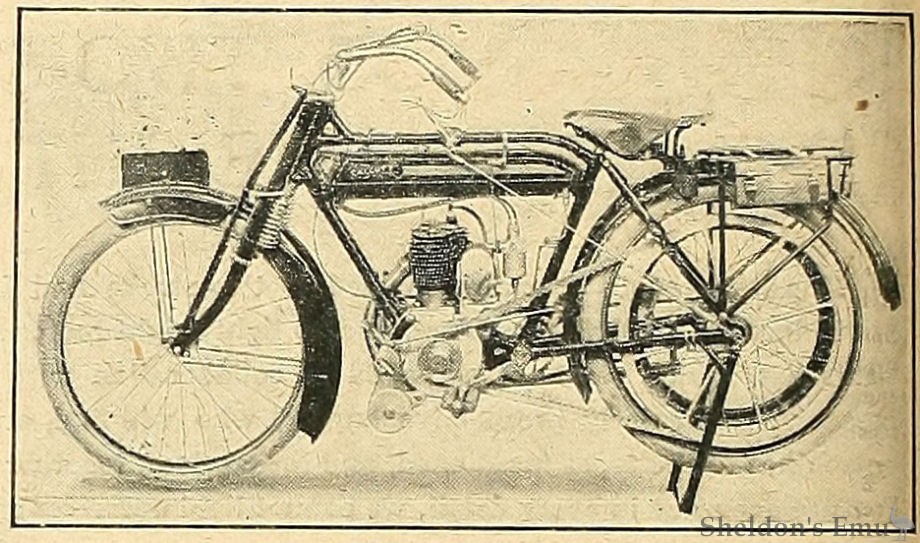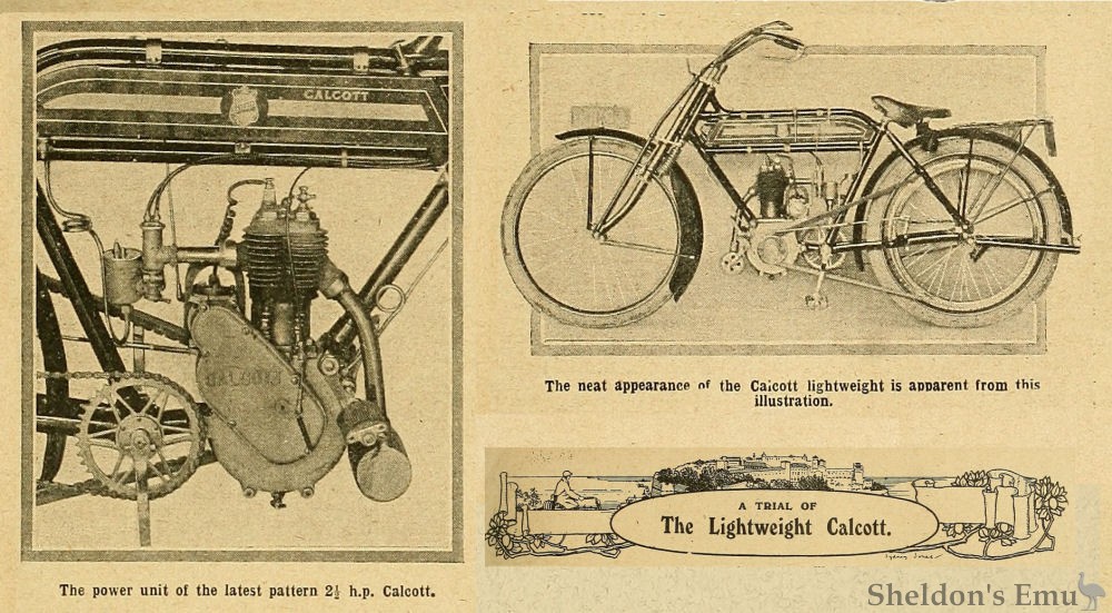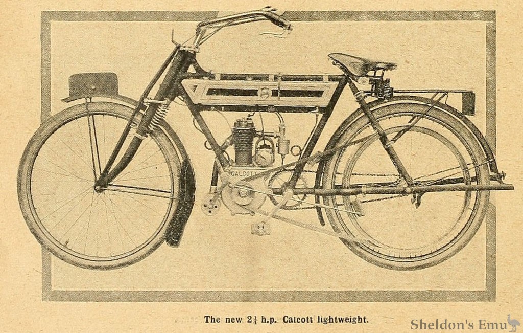 Two motor-bicycles, priced at 45 guineas and £32 respectively, will be staged here. The 3 1/2 H.P. Calcott carries the following specification The engine is a White and Poppe with 85 mm, bore and 85 mm. stroke, rated at 4.5 H.P. The frame is built very low and exceptionally strong. The front rim brake is actuated by inverted lever, the back foot brake acting on the belt drum operated from the frame; the forks possess the Druid patent spring; the wheels are 26in. by extra strong, fitted with Dunlop rubber-studded non-skid tyres. A very strong and light, tubular carrier is attached, as well as a stand fixed on the chain stays. The light-weight Calcott has a 1 H.P. single-cylinder with 62 by 70 mm. bore and stroke; Bosch high-tension magneto; Druid spring forks; Lycett saddle, and Dufaux carburetter is fitted.
