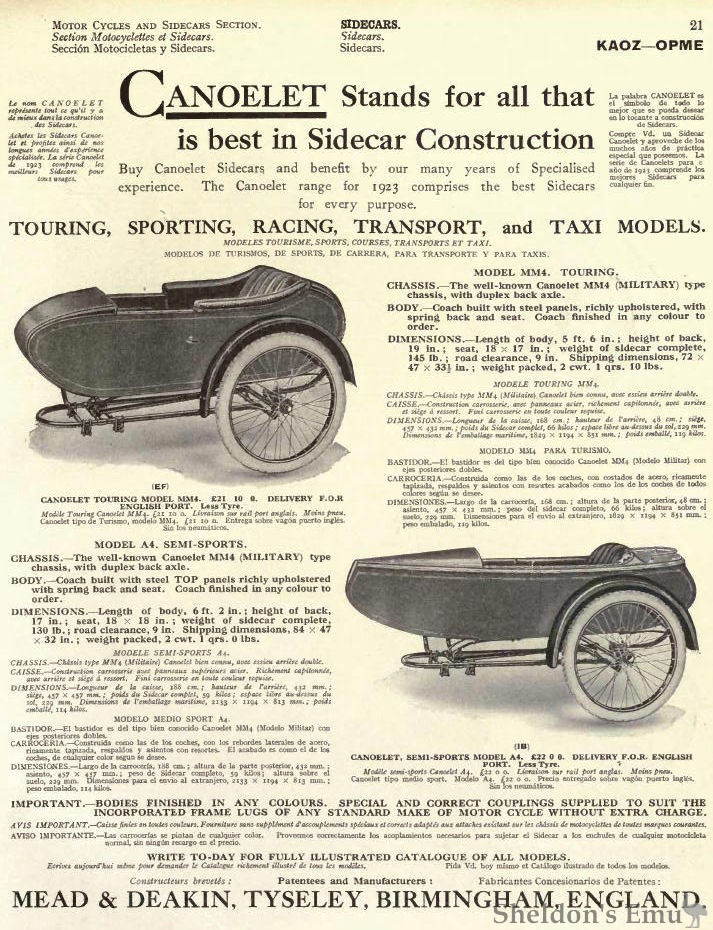 The selection of Canoelet sidecars offered by Mead and Deakin is exceptionally complete and is very wide in its appeal, no fewer than eight being staged. All the models are distinguished, too, by their graceful lines and beautiful finish. Another point which marks the care in production is the variety in chassis design, which seems to have been considered in conjunction with the type of body used.