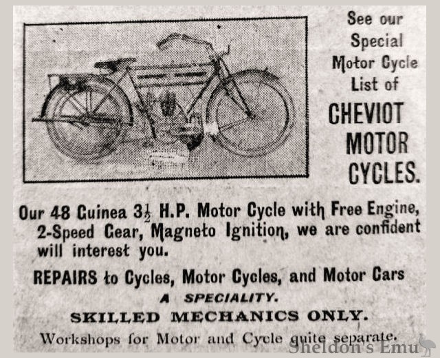 A Cheviot motorcycle was ridden by W Atkinson in the 1909 Scottish Five Days Trial
