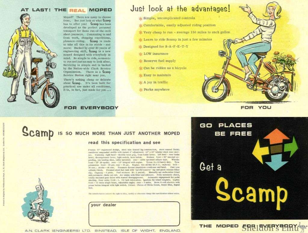 The model was a moped which used a small-wheeled bicycle frame sourced from CWS of Birmingham and sold as the Clark Scamp. A 49cc two-stroke engine of their own manufacture was mounted to the left of the pressed-steel rear wheel. Transmission was provided by clutch and direct gearing, and a flywheel provided direct lighting. The brakes were drum to the front and caliper to the rear. The drive gears were prone to wear.