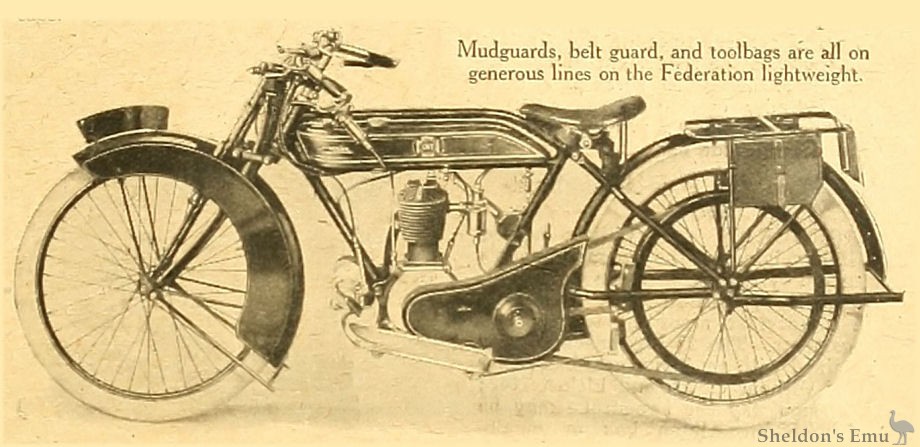 ALTHOUGH quite a new machine the Federation is beginning to show up well in Midland competitions. The aim of the makers has been to make a utility weatherproof lightweight while embodying standard and well-tried components. A 2¾ h.p. J.A.P. engine and Sturmey two-speed gear box with clutch and kick-starter are used, while the simple mudguarding, neat chain and belt guard, and very deep toolbags are points hat will at once appeal to the average rider.