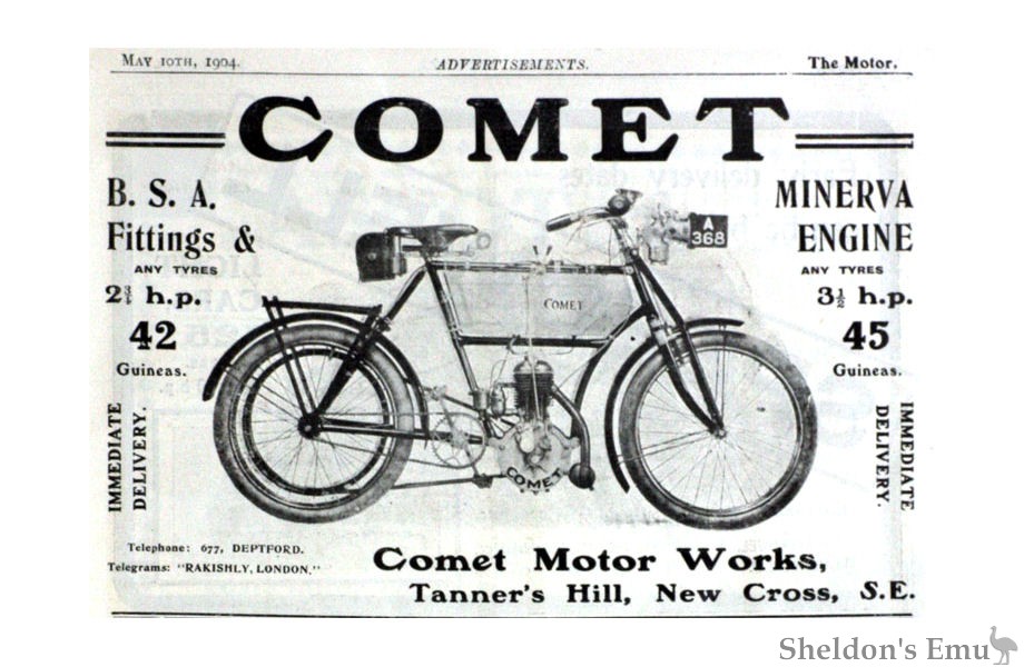 Comet produced motorcycles from 1904 to 1905. They built machines using Minerva 2¾ hp and 3½ hp engines fitted into BSA cycle parts. Typical of the era, they were very primitive and had braced forks, diamond frame and belt drive. Like many other companies of that time, it was very short-lived.