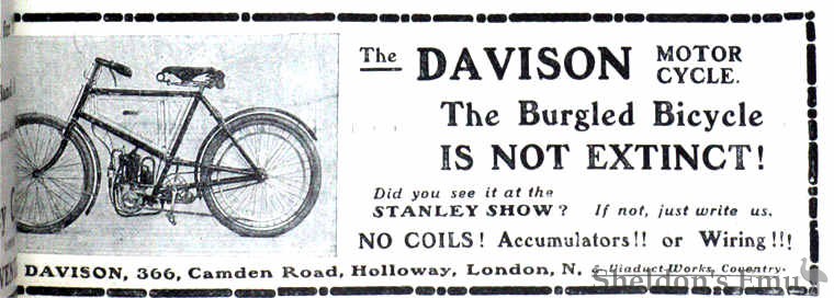 A. C. Davison of Viaduct Works, Coventry produced motorcycles from 1902 to 1908. The machines were primitive and were fitted with 2hp and 2¾ hp Simms or 2hp Minerva engines. The 1904 model had both petrol and oil gauges.