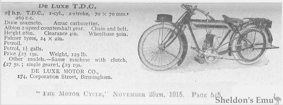 N.B. A De Luxe engine was built by F.W. Spacke Machine Co. of Indiana, produced around the same period. Spacke engines were to be imported by Maudes Motor Mart according to The Motor Cycle, November 5th 1914.