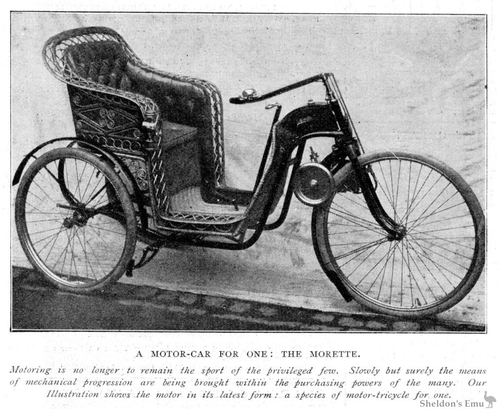 The doublĂ© "Morette" is suitably strengthened in all parts to carry two persons, and a higher powered motor is used. The frame is built with 1 1/8 in. steel tubes strongly braced and strengthened to suit requirements, the attachments to the ball head and rear axle being strongly and carefully made. The front forks are also strongly built. The front wheel is a 28 inch wheel, fitted with 1¾ in. Swain tandem tyre for the single Morette, and 2 inch Swain motor tyre for the double Morette, the inner tube being a self-sealing air chamber. The rear wheels are 26 inches, and are also fitted with Swain tyres. The engine is a two-cycle valveless motor, the fly wheel of which carries on the inner side a rubber-covered driving wheel in frictional contact with the front tyre. The engine is carried by a bracket behind and attached to the crown of the front fork. It is carefully balanced on both sides of the wheel, and is lubricated on the drop-feed principle, the oil being atomised as it is carried into the engine with the petrol mixture. The cylinder of the engine when in action is inclined slightly upwards.