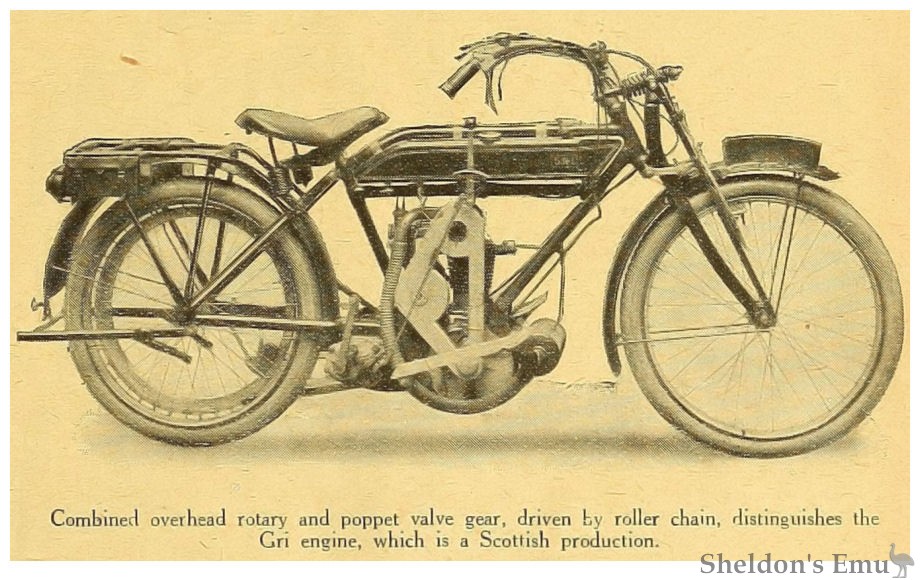The machine was first promoted in 1920 and was produced in 348cc and 496cc sizes with one overhead valve opened by a chain-driven ohc and rocker, and a rotary valve.