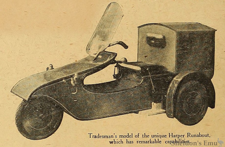 The Harper runabout stands in a class by itself. Its designers, recognising the demand for an exceptionally light, handy vehicle giving complete weather protection, have succeeded in producing a most, attractive little three-wheeler. Low upkeep and running costs are claimed for it, and, considering the power unit is only of 269 c.c. capacity and the entire weight only 280 lb., the claim may well be justified. A three-speed gear, chain transmission giving direct drive on all speeds, Zenith carburetter, independent foot and hand brakes, starting from the seat by lever, and foot acceleration are details which go to the making of a workmanlike little runabout.