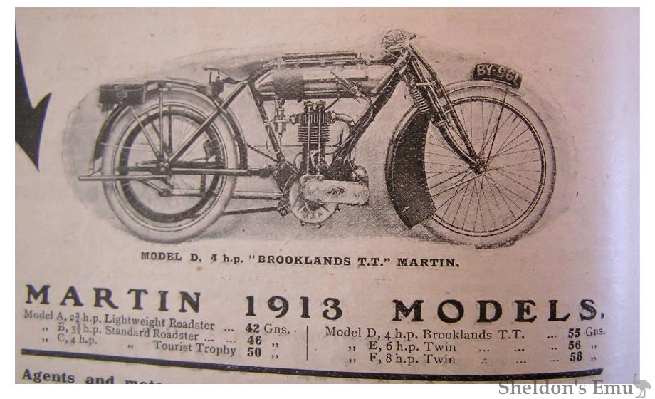 1914 The company expanded and was listed as Car and Motor Sundries of Shaftesbury Avenue, London. By now the range went from a 2hp ohv single to an 8hp V-twin. The smallest had a Precision engine and was listed as the Martin Junior.