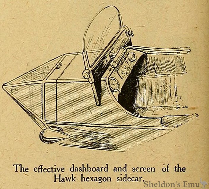 If the evidence of the road is any criterion, the sporting type of sidecar is slowly replacing the old high back and broad nose models. In the Hawk range there are to be found streamline patterns which offer the minimum of wind resistance. This question has been closely studied by the designer, and he has found from practical experience that the models he has on placed market are ideal for the man who wishes to carry the minimum dead-weight and at the same time provide comfort for the passenger and give reasonable luggage space.