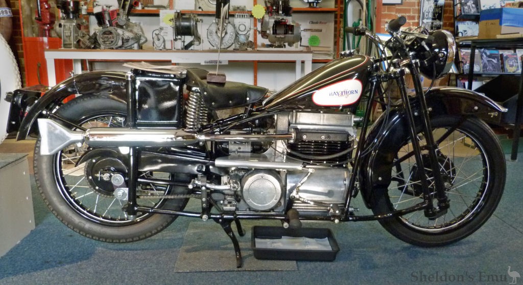 A handcrafted motorcycle which has an oil-cooled OHC four-cylinder engine with a novel two-speed transmission using two different transmissions per chain to the rear wheel. The second of only two built is on exhibition at the Sammy Miller Museum. It was constructed by John Haythorn, a Scottish automotive engineer who worked for a supercharger manufacturer. Its development ended when he was transferred to support the war effort in 1940, but it was already a usable machine that had been presented to the motorcycling press.
